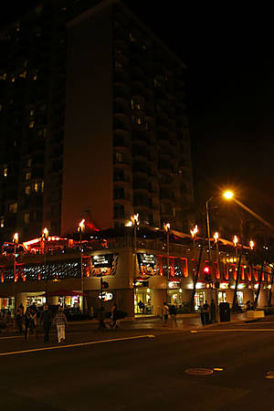 Слово "Вайкики" в моем представлении раньше блестело и грало яркими огнями, примерно как "Лас Вегас", или "Бродвей". На деле оказалось все по другому. Здесь нет ярких громадных неоновых реклам, отели освещены скромно. Улицы тоже, а аллеи в парках и вовсе освещаются факелами... Но как это здорово смотрится. Видно, что это в первую очередь курорт для отдыха...