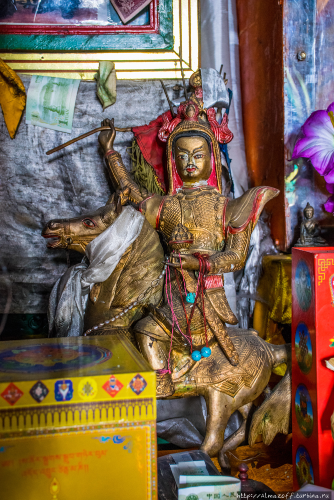 Поднялись до первого храма, называется Гонме. Несмотря на наличие нескольких статуй и изображений Карма Кагью, видно что гелугпинский. Находится в состоянии затянувшегося ремонта или даже разрухи.