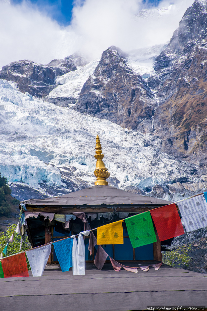 Ледник огромным языком сползает с крутых склонов по ущелью в долину. Впечатляет! Такой крутой ледопад наверное только ледопад Кхумбу на Эвересте. На саму Кава Карпо предпринимались попытки взойти, но все альпинисты тех экспедиций так и не вернулись с горы...