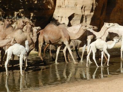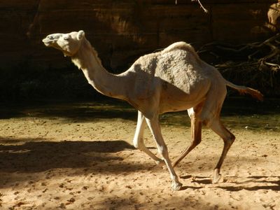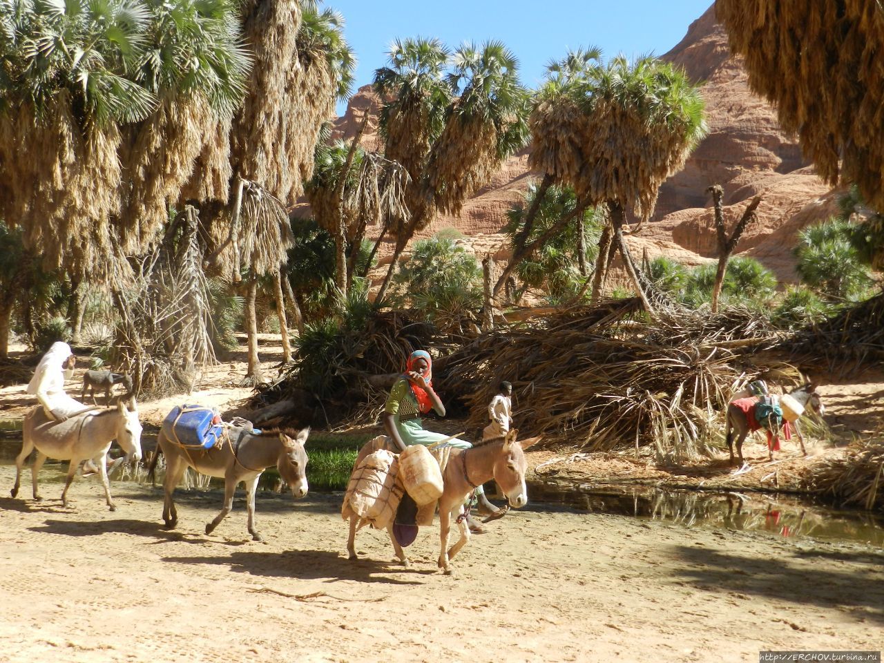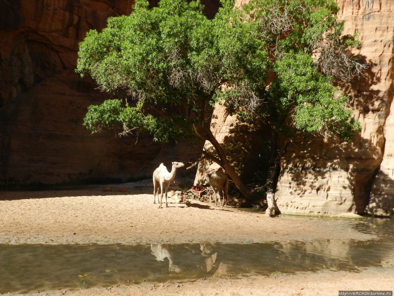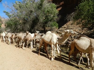 Погружённые в свои мысли, мы молча стояли, любуясь красотой. Где-то сверху кричали бабуины, им подпевали птицы. Ручеёк, тихонько журча, искрил рябью на солнце и после с удовольствием прятался в тень. Вдруг послышался приближающийся рык и мычание. Звуки подхватило эхо и каньон ими наполнился от стенки до стенки. Самих верблюдов не было видно, но топот и мычание нарастали. Наконец, из-за поворота показалось стадо, неспешное и горделивое. Подойдя ближе и увидев чужаков, животные напряглись и остановились. Мальчишки погонщики хлестнули кого надо плёткой. Верблюды ринулось вперёд. Пастушки довели подопечных до самого широкого места и предоставили самим себе. Те начали пить воду, но не с жадностью, а с достоинством.