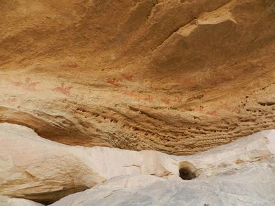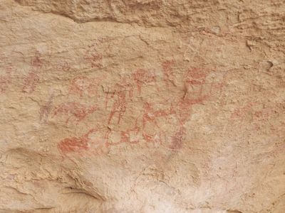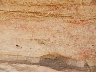 Двигаясь по так называемому балкону, мы то тут, то там находили наскальные рисунки. К чему-то подойти можно было свободно, тогда как к другим рисункам приходилось подбираться, сгибаясь в три погибели. В большинстве случаем художники изображали лошадь, либо одиночную, либо со всадником, причём кавалерист был вооружён копьём. Где-то изображения едва проступали, где-то их было много и они были чётко видны. Художника давным-давно нет на этом свете, а его изящные кони, прорисованные красной охрой, всё скачут и скачут...