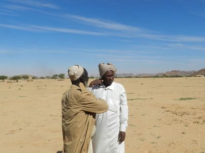 Он очень плохо видит и потому опирается на внука. Повара из технического джипа высаживаются. Старик с ребёнком садятся на их место, после чего мы всей колонной отправляемся по маршруту. Далее выясняется, дедушка не просто дедушка, а местный шейх. Его общине принадлежит гельта, куда окрестные пастухи пригоняют на водопой домашних животных.