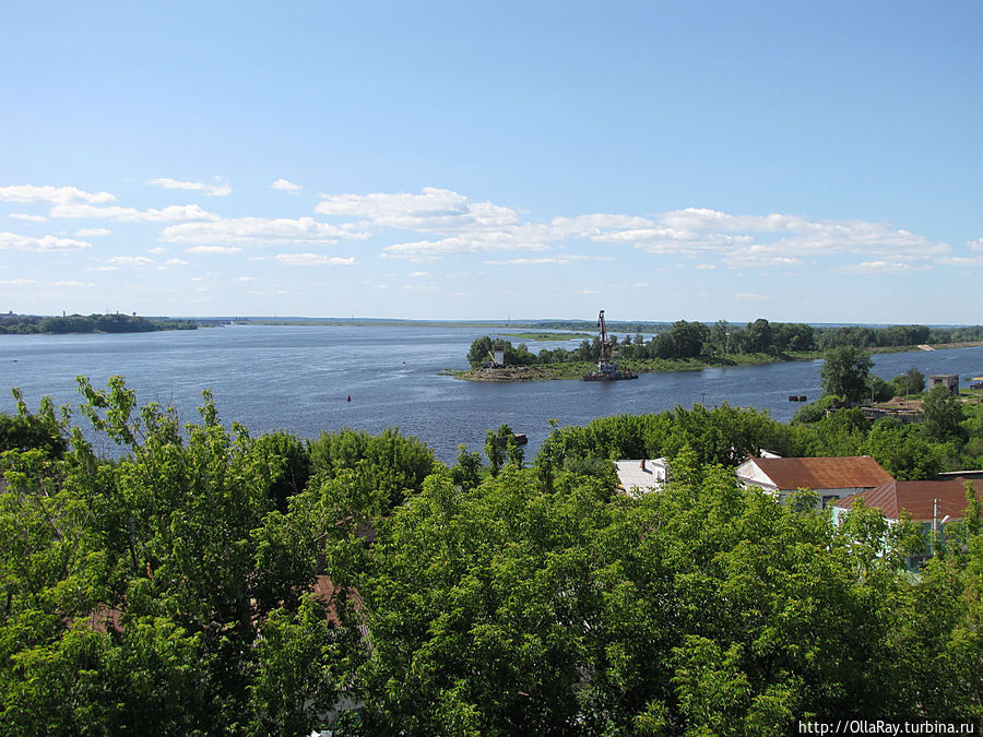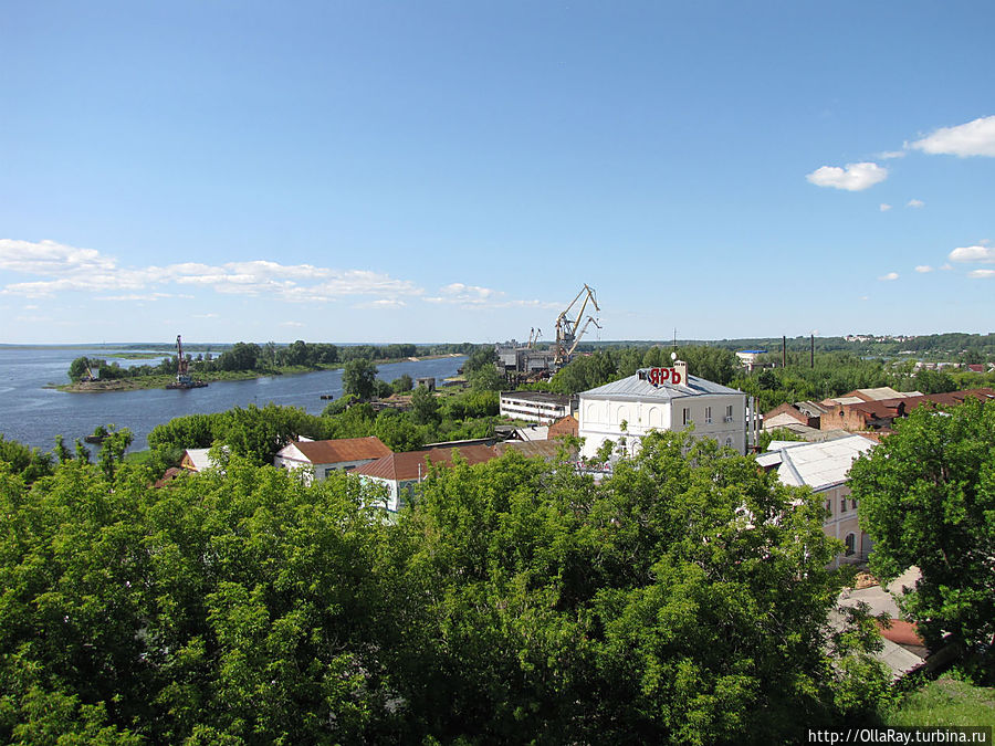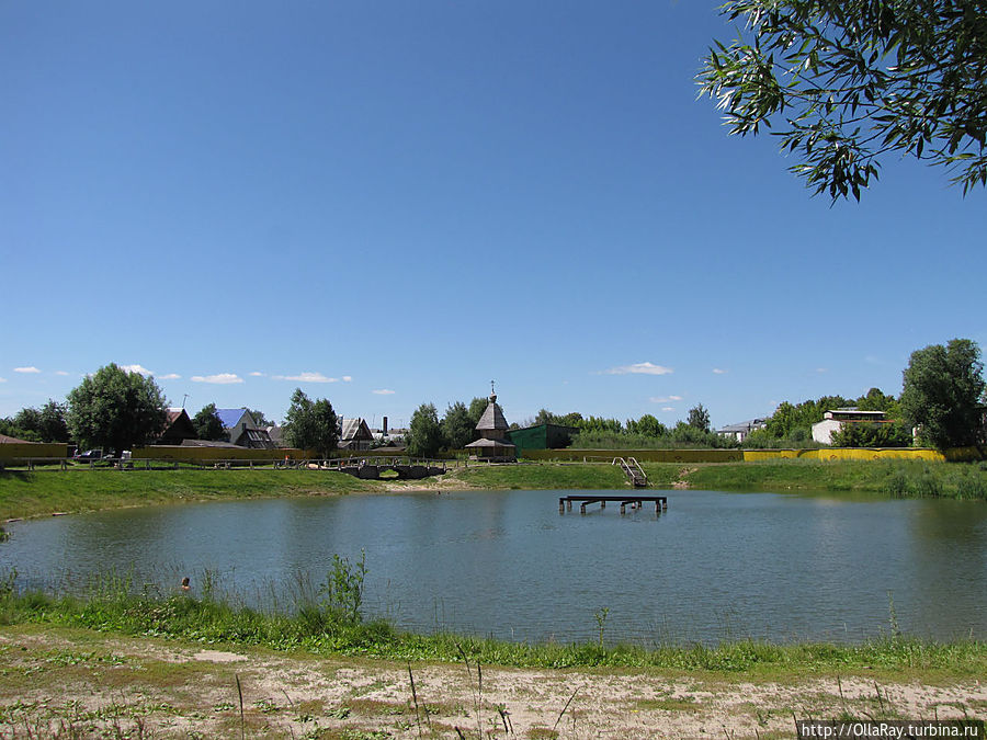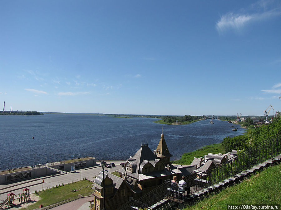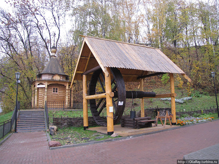 А вот теперь самое время сесть в машину и спуститься по Большому Кировскому съезду, повернув налево в самом низу, к Городу Мастеров или, проще говоря, к пристани. Это избавит вас от утомительного подъёма по лестнице по пути обратно. Для автомобилей там сделана специальная бесплатная парковка. Подышите рекой, послушайте шум волн, а может быть, вам даже захочется искупаться. Ну и потом уже прогуляйтесь вокруг построенного недавно музея народных промыслов — Города Мастеров. Наверное, именно этот музей произвёл наименее приятное впечатление на меня. Да и вообще правильность размещения его именно тут весьма сомнительна. Это может быть оправдано лишь с той точки зрения, что нужно было прикрыть монолитную бетонную набережную, сменившую стоявшую здесь долгие годы пристань — дебаркадер. А по большому счёту музей — объект чисто туристический. В нём вам по-быстрому расскажут о различных ремёслах и предложат приобрести сувенирные изделия: свистульки, вышивку, гончарные изделия и т.д. Я бы сказала, что посетить это место можно "для галочки". Ну и раз уж тут оказались, то куда интереснее будет погулять вокруг терема и посмотреть на учёного кота, поленницу с симпатягой- мишкой, деревянную часовенку и колодец.