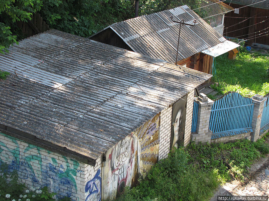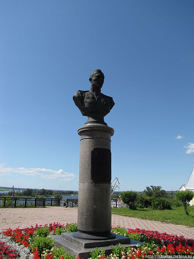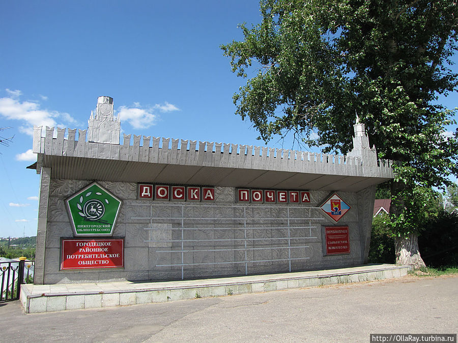 А сейчас я предлагаю вам сделать небольшой кружок и пойти направо вдоль ограждения высокого берега. Буквально сразу перед вами откроется потрясающий вид на Волгу. Остановитесь на пару минут и полюбуйтесь на речные будни: наверняка в этот момент в сторону шлюзов будет проходить какой-нибудь крупный корабль или, снующий туда-сюда, рабочий речной "ослик" — буксир ОТ (озёрный толкач). Посмотрите на панораму шлюзов, судоверфи и самого города с отдалёнными районами. Здесь же обратите внимание на здание РАЙПО. Такой плиткой в советское время были отделаны фасады многих торговых точек Городца. Правда же, симпатично? А ещё очень интересна монументальная доска почёта того же РАЙПО: почему то на крыше изображён не нижегородский (уж если на то пошло), а московский кремль! Вот такие коллизии. До недавнего времени доска пустовала на протяжении многих лет, поэтому фотографирование себя любимого на фоне надписи "ДОСКА ПОЧЁТА" было обязательным номером туристической программы. Поверните направо за Доской и дойдите до симпатичного мостика через овраг. Посмотрите с него вниз и оцените творчество современной молодёжи, которой жанр граффити не чужд. Но ведь вы не ожидаете, что и старые гаражи здесь будут оформлены в стили городецкой росписи?:) От мостика пройдите немного прямо мимо жилых домов. Наверняка вас тоже посетит слегка завистливая мысль: как хорошо жить в такой красоте и тишине! По пути вам попадётся симпатичная водяная колонка. Таких колонок много в городе — из них в своё время набирали воду для самых разнообразных нужд. И если вы испытываете жажду, то можете смело попить из неё. Вода в Городце вкусная, родниковая! За колонкой вы увидите площадку с зелёным газоном и памятником-бюстом. Вот это и есть сквер Ворожейкина. Чем же он примечателен? — спросите вы, — Не на газон же посмотреть мы сюда шли! Нет ничего удивительного в том, что в этом городе установлен памятник Арсению Васильевичу Ворожейкину — писателю, военному лётчику, дважды герою советского Союза. Ведь он уроженец этих мест и своими делами прославил родину. Но даже не этим примечателен сквер. Сейчас вы находитесь на месте, где до 30-х годов прошлого столетия стоял главный храм города — величественный Троицкий собор, возведённый здесь ещё в 17 веке!