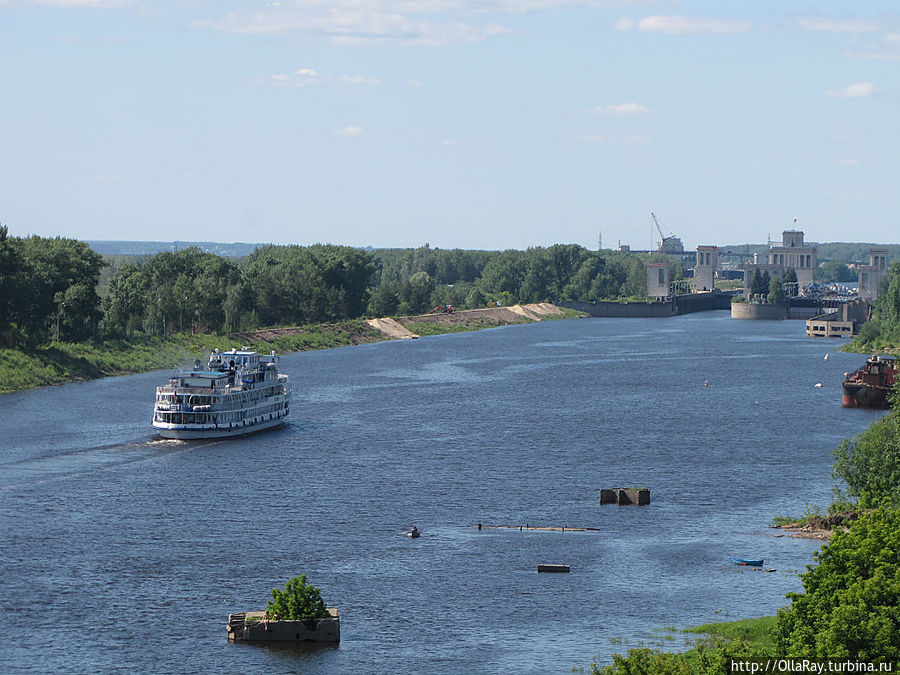 Вот, пожалуй, мы и пробежались по всем основным достопримечательностям. Далее пойдут "интереснинки" для любителей активного отдыха. Доехав по "низу" до развилки, вы увидите что дорога резко пойдёт в гору. Если продолжить движение по ней никуда не сворачивая, то вы попадёте в центр посёлка речников. Ориентиром будет служить здание клуба, напоминающее дворянскую усадьбу. Посёлок представляет собой район застройки 50-х годов прошлого века. Пожалуй, он будет интересен тем, кто вырос или провёл много времени в таких местах и испытывает чувство ностальгии. За клубом есть чудесная берёзовая роща. А если пройтись вдоль края высокого берега, то вам откроется панорама среднего бьефа Волги (участок реки между двумя парами шлюзов). И поверьте, что это стоит увидеть! Спустившись под гору по бетонной ажурной лестнице либо переехав туда на автомобиле, вы попадёте к пристани и погрузочной площадке. Здесь тоже найдётся "пища" для любителей "фотоохоты": строгие здания шлюзов, грузовые суда на рейде, доки судоремонтной базы, поросший берёзами высокий берег и синяя вода — всё это складывается в очаровательные пейзажи средней полосы. Рядом есть пляж, так что можно отдохнуть у воды часок-другой. Слева вы увидите дамбу. И ещё несколько лет назад я бы советовала пройтись по ней до самых шлюзов и даже перейти Волгу по мосткам нижних ворот обеих камер. А если очень повезёт, то и договориться об эксурсии на шлюз. Поверьте, это очень интересно, особенно если вам попадётся хороший рассказчик. Вам рассказали бы что такое "королёк" и почему у него всегда так много чаек; как работают ворота и почему одни раздвижные, а другие цельные; сводили бы на мостик и показали пульт управления, а может быть бы даже проводили до маяка. Но это всё было возможно тогда, во времена доверия к незнакомому человеку. Сегодня дамба уже от пляжа обнесена колючей проволокой, на которой висит знак с надписью по типу "Посторонним В." Однако, совсем недавно мне попался рассказ с фотографиями о том, как двое друзей были на экскурсии на шлюзах. Поэтому, допускаю, что каким то образом и совершенно официально попасть на такую экскурсию можно и сейчас. И ещё чуть-чуть о стратегических объектах:) У противоположной пары шлюзов вы увидите мост, а чуть далее Горьковскую ГЭС. В принципе, очень хорошие фотографии всего этого можно сделать с высокого берега, но говорят, что и на ГЭС теперь есть экскурсии.