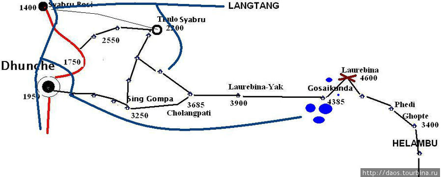 Более простой вариант, который требует 8-9 дней — идти сразу на Госаикунду от Дунче (Dhunche). До Дунче можно доехать на автобусе от Катманду (хотя расстояние небольшое, но дорога сумасшедшая и займет не менее 7-8 часов. В муссоны и после муссонов дорогу размывает, и автобус прерывается, часть пути через размытую зоны придется делать пешком, а выше идет верхний автобус, который оказывается отрезанным от цивиизации).