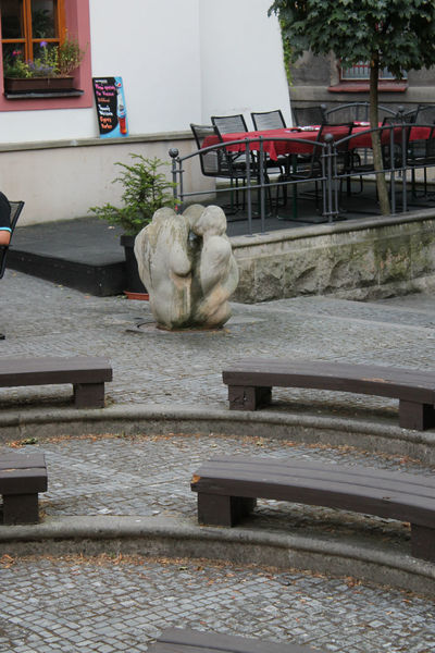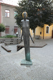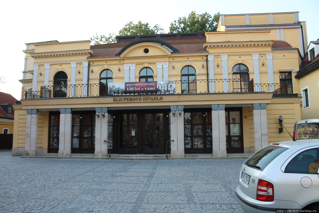 Лестница приведет нас прямо к местному театру Кличперы. Первая премьера состоялась в 1885 году. Удачное начало было омрачено впоследствии трагедией во время которой обрушились стены здания. Слава богу никто не пострадал. Лишь спустя два года здание восстановили и постановки продолжились. С 2002 года в честь основателя театра в июне месяце проходит фестиваль европейских театров. Рядом во дворе летнего театра скульптура Евы с вытянутой шеей и парочка, переплетенная в объятьях.