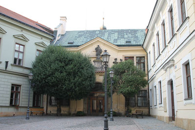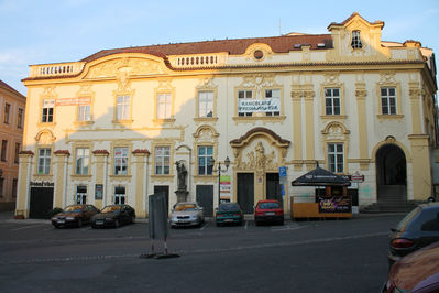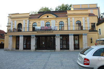 Театр находиться на улице Dlouhá. По ней мы и продолжим движение, пока улица не повернет налево. Здесь на соединении с улицей Zieglerova красивое желтое здания со скульптурой Яна Непомуцкого — Городской музыкальный дворец. С этого места начиналась славная история Градца Кралове. Здесь находился дворец, резиденция вдовствующих королев Элишки Рычки, Элишки Поморжанской и других. Замок разрушили , а на его месте построили семинарию с церковью Яна Непомуцкого.