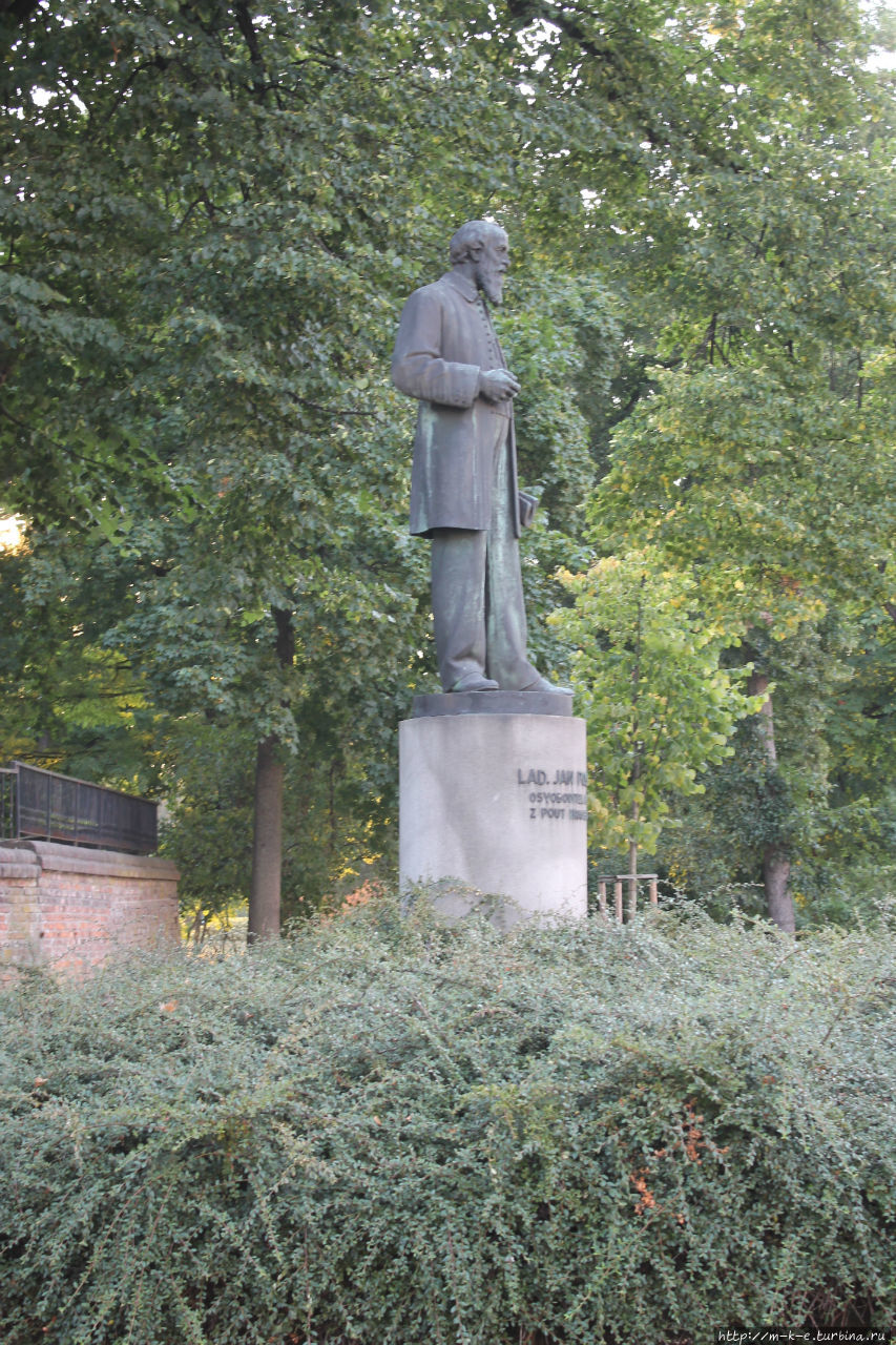 Все это мы рассматривали из парка от памятника заместителю мэра Ladislava Jana Pospíšila. Под его руководством были найдены остатки городских крепостных стен. Продолжим прогулку по аллеям парка. Здесь множество скульптур: официальных и развлекательных. Одна из них памятник Яну Жижке — великому чешскому полководцу. От этого памятника поднимемся вверх обратно в старый город.