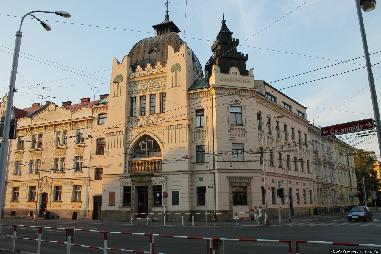 Здесь на пересечении с улицей Československé armády стоит обернуться и назад. Поводом для этого послужит башня, оставшаяся от Силезких ворот. Напротив башни здание с женской фигуркой, устремившейся вниз. Это здание студия «Беседа» при городском театре Кликперы – именно здесь в 1796 г. Вацлав Климент Кликпера, основатель местного театра, ставил свои первые пьесы.На перекрестке, где мы стоим слева желтое двухэтажное здание. Ранее тут размещался инженерный офицерский корпус, а сейчас ресторан. Рядом с церковью слева региональный суд.