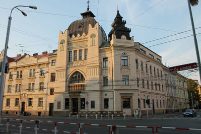 Сейчас повернем налево, чтобы прогуляться по парку, опоясывающему старый город. Параллельно будем рассматривать архитектурные строения бульварного кольца. И начнем с желтого здания, напоминающим здания Риги, построенные в Югендстиле. Это Коммерческая школа, бывшая школа искусств и работы по металлу. Слева через улицу здание с пальмами — бывшая синагога.