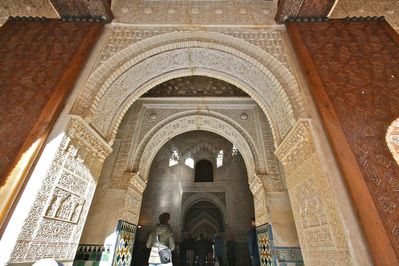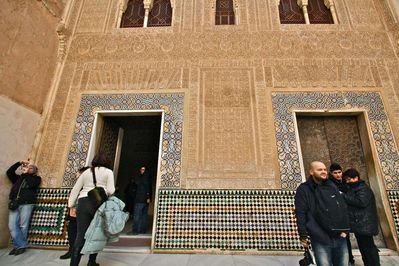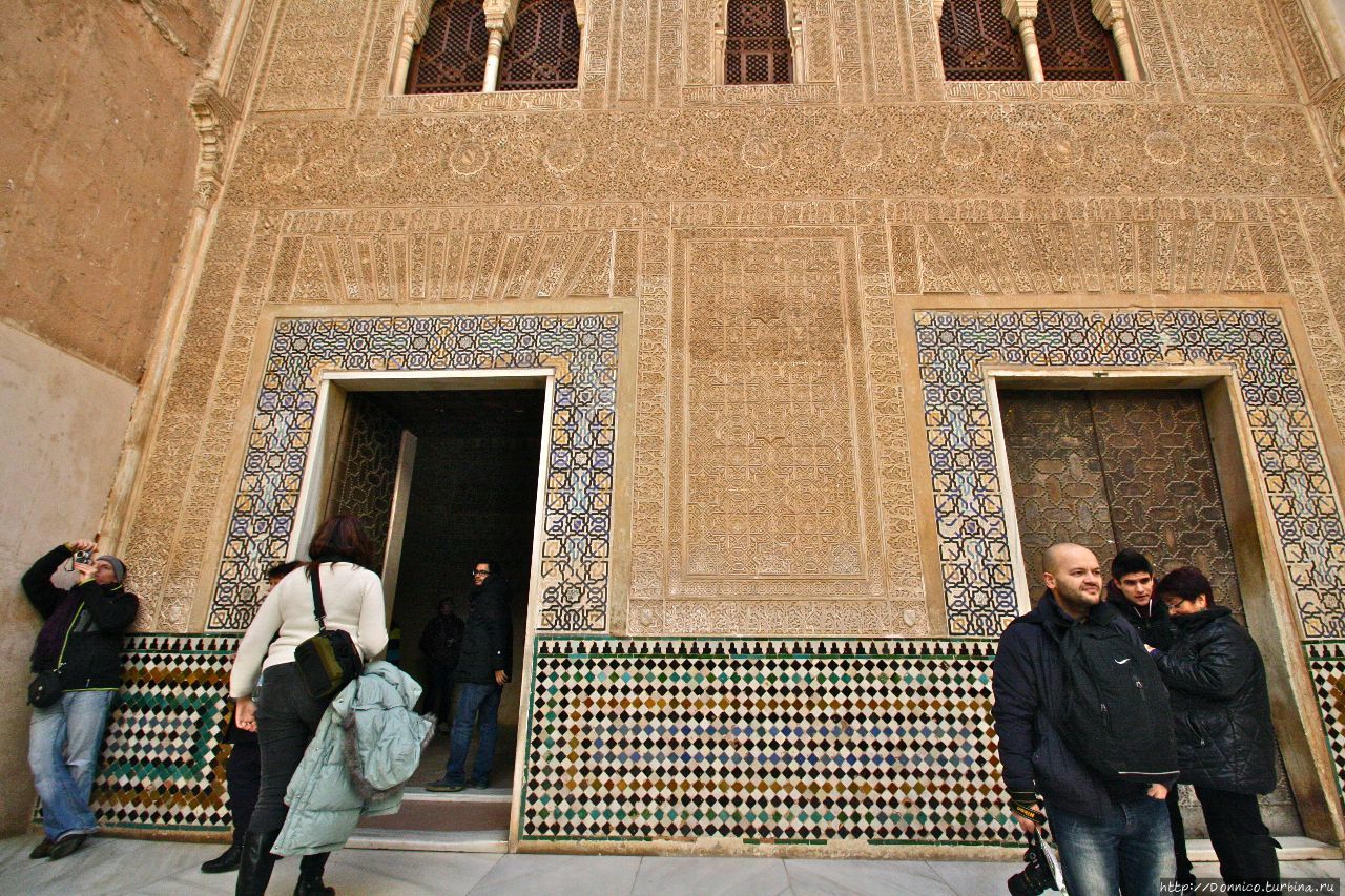 На стенах этого портика написанные арабской вязью письмена, восхваляющие эмира, причем большая их часть как и Коран написана в стихах. Барельефы с арабской вязью находятся над изразцами, которые здесь появились уже позже при христианах в 16 веке, но надо сказать, что они совсем не портят впечатление и находятся между собой в полной гармонии.