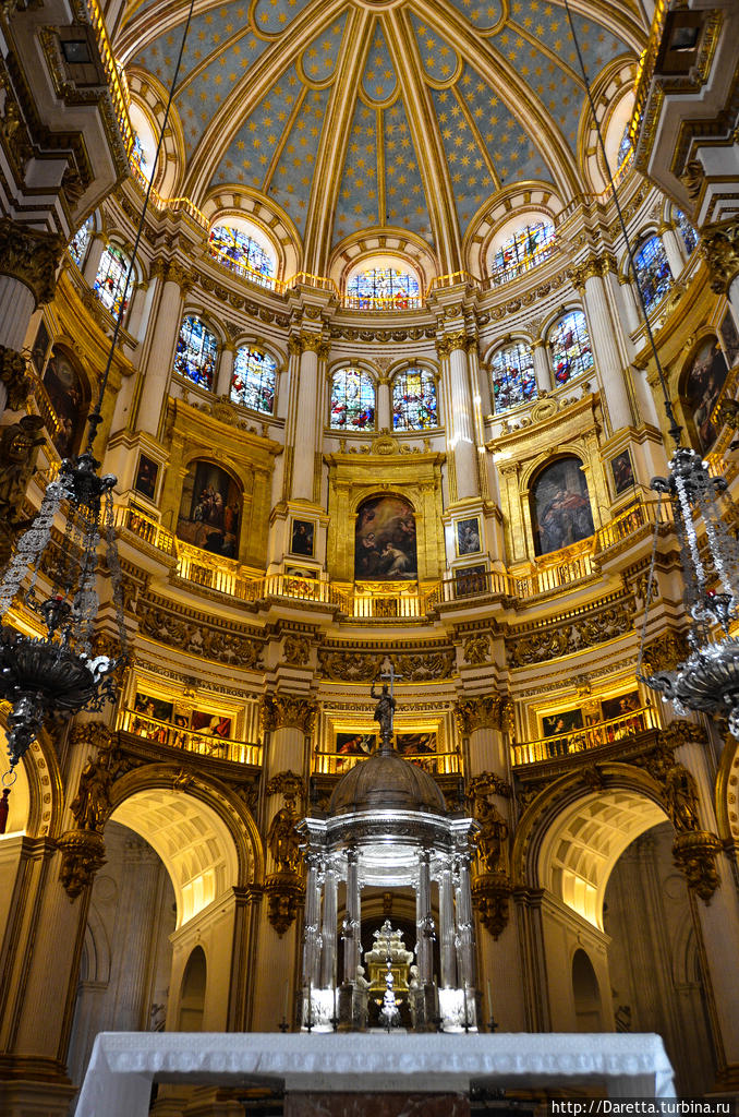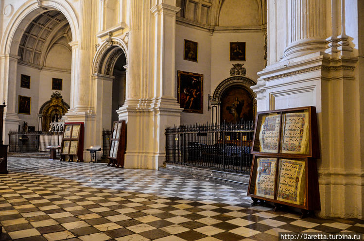 Потом когда уже окончательно кружится голова видишь и позолоту и картины, и пол, создающий еще больший масштаб. Здесь вообще главное слово- МАСШТАБ — он во всем! И, надо сказать, короли отнюдь не скупились доказать свое преимущество над маврами. Я, живя в те времена, может, королей и не любила бы, но в Собор точно бы ходила.... и веру может быть приняла, ну хотя бы так для галочки, чтобы опять же в Собор попасть.... Интересно думали так в те далекие времена жители Гранады...