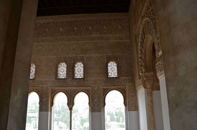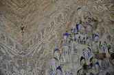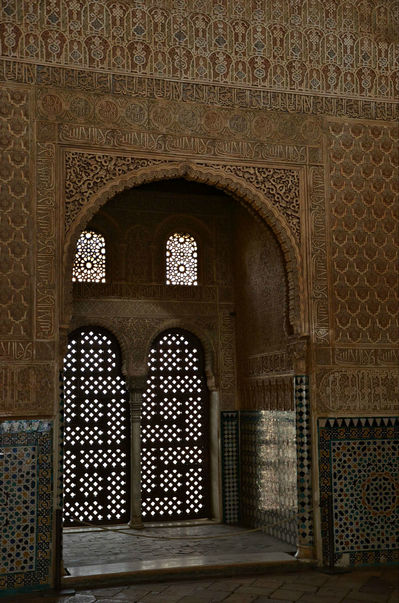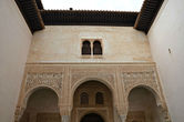 Щёлк: сооружения, фасады зданий. С внешней стороны они ничем не украшены, все сокровища спрятаны внутри. Названия внутренних двориков говорят сами за себя: «Миртовый» — украшен вечнозелёными безворсовыми коврами – картинами, миртовыми шпалерами; «Львиный дворик» — с фонтаном, вокруг которого застыли 12 каменных львов. Число львов неслучайно. Согласно легенде, 12 львов поддерживали трон царя Соломона, и об этом султану Мухаммеду аль-Гани рассказал его визирь ибн-Нагрелла, еврей по происхождению. Он же и посоветовал султану украсить фонтан фигурами львов, которые в Альгамбру принесли из старого дворца в Альбуйеине. На фонтане сохранилась надпись: «Смотри на воду и смотри на водоём, и ты не сможешь решить, спокойна ли вода или струится мрамор». Щёлк: ещё один дворик с двумя огромными плитами из белого мрамора в полу – «Зал двух сестёр». Щёлк – щёлк: художественная резьба по штукатурке. Здесь она выражена особенно ярко. В строительстве использовались недолговечные глина и алебастр – тем и удивительнее, что так здорово сохранились! Щёлк – щёлк: купол, выполненный в виде сот — самый крупный из арабских сталактитовых сводов, который составляют около 5000 ячеек.