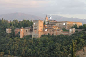 7 Церковь Санта-Мария-де-ла-Альгамбра (Iglesia de Santa María de la Alhambra). Построена в 1581—1618 гг. на месте Большой мечети по планам Хуана де Эрреры и Хуана де Ореа архитектором Амбросио де Вико, несколько упростившим их. Имеет в плане форму латинского креста. Барочный алтарь с витыми колоннами выполнил Алонсо де Мена в 1571 г., так же как распятие и статуи свв. Урсулы и Сусанны. Главную статую, Святой Девы Печалей (Virgen de las Angustias), представляющую собой пьету, изваял в 1750—1760 гг. Торквато Руис дель Пераль. Во время Страстной недели эту статую торжественно проносят крестным ходом на серебряных носилках, изображающих аркады Львиного дворика.