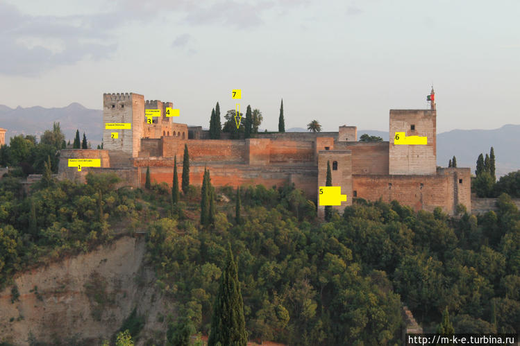 То что справа от черты это Алькасаба (крепость) — это древнейшая часть комплекса Альгамбры. Построена в VIII-XIX веках. Вот отдельная фотография. На ней и посмотрим, то что видят туристы со смотровой площадки. ( Цифры на фото совпадут с текстом)