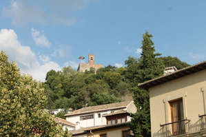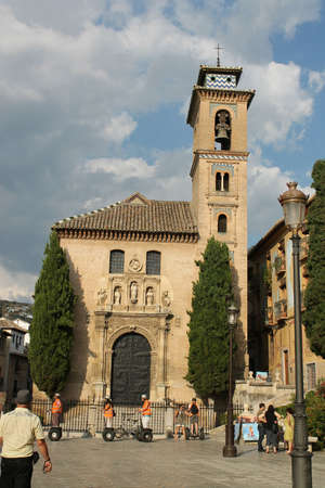 Неплохой каламбур для начала заметки. Попав на площадь не будем спешить осматривать саму площадь. Сначала бросим взгляд на холм Альгамбра, где находится жемчужина европейской архитектуры. Этот дворец-крепость вершина мавританского искусства. Отсюда с площади видна смотровая башня Алькасабы самой ранней части крепости.В самом дальнем углу площади Церковь святого Эгидия и святой Анны (Iglesia de San Gil y Santa Ana) Здание построено в стиле мудехар в 1537 году на месте мечети. На память от мечети остался минарет, превращенный в колокольню в правой части фасада. Главный портал церкви украшен коринфскими колоннами и увенчан скульптурами. Из интернет источников в интерьере церкви советуют посмотреть деревянные перекрытия в стиле мудехар, фрески 16 и 17 веков и в капеллах храма интересные скульптуры, в том числе "Мария Долороса" работы Хосе де Мора (1671) и "Распятие" Диего де Аранда.