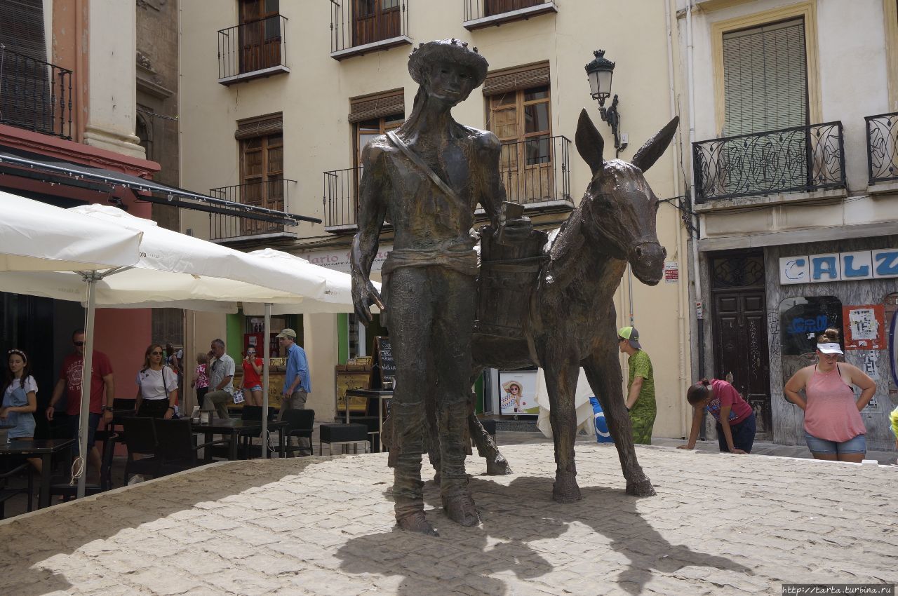 Скульптура – это всегда дань прошлому. Без водоносов и водовозов в жаркой Испании было не обойтись. Профессия водоноса и торговля водой существовала в Гранаде с XI века и сохранялась, как бы странно это не звучало, до середины XX века. Уже не на осликах, конечно, а более цивилизованным образом, но водовозы без работы не сидели. Воду продавали пешеходам на улицах, развозили по домам, не имевшим других источников водоснабжения.
