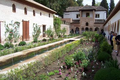 Мы начали осмотр Альгамбры с садов Хенералифе, которые находятся чуть выше на холме Сьерро-дель-Соль. Это позволило сначала увидеть прекрасную панораму Альгамбры сверху. Между ними находится овраг, через который когда-то существовал мост, их соединяющий. Хенералифе был летней резиденцией эмиров Гранады. Поэтому его дворец не блещет архитектурой в сравнении с дворцами Альгамбры. Однако Верхние и Нижние сады, Патио-де-ла-Асекиа — Дворик Оросительного канала, Хардин-да-ла-Султана – сад Султаны или Кипарисовый двор (там можно увидеть кипарис, который видел эмиров, так как ему более 600-от лет), производят впечатление. К сожалению, в апреле я не увидел много из того, что можно увидеть летом. Зелень еще не воспряла после зимы, цветов почти не было. Тем не менее, фантазия дорисовывала недостающие краски.