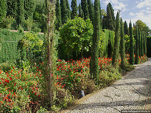 Здесь есть все в угоду прихотливому вкусу: изобилие плодов и цветов, тонкие ароматы, зеленые беседки и миртовые ограды, чистейший воздух и плеск струй, зеленые аллеи, итальянские лестницы, величавые террасы и мраморные балюстрады, открытая галерея или колоннада, откуда открывается изумительный вид на Альгамбру, город и Вегу в глубокой низине – и на дальние горы у горизонта: все это волшебное зрелище мерцает и переливается в струистом осеннем зное.
