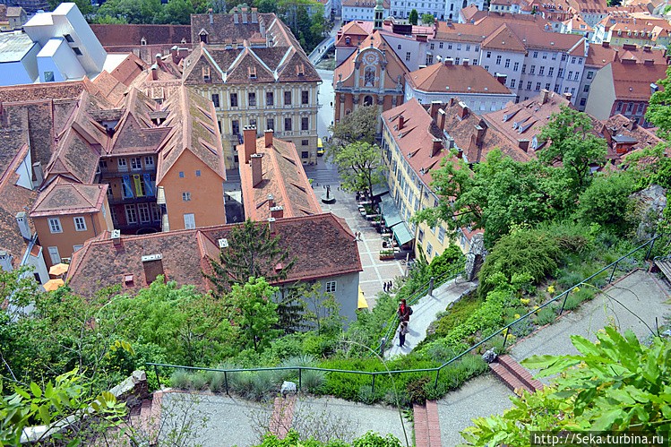Пообедав в Nordsee на улице Херренгассе, я пошла пешком до Шлоссбергбана. Идти нужно все время прямо мимо Главной площади. Шлоссбергбан будет справа. В 12:30 вагончик за 2 евро умчал меня наверх.