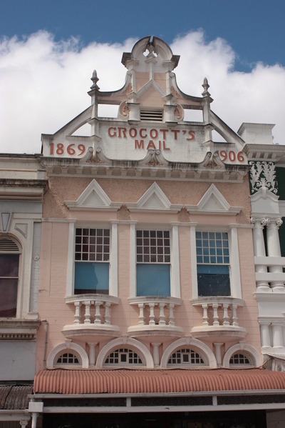 Рядом с этим «M&G», левее, расположено другое примечательное здание с узким фасадом, и это Grocott’s Mail, что означает название старейшей сохранившейся независимой газеты в Южной Африке. Основанная в 1870 году (включая журнал, издаваемый в Грэхэмстаун, который был основан в 1831 году), эта еженедельная газета пережила много лет, и сегодня она остается единственной газетой, которая публикуется в Грэхэмстауне.