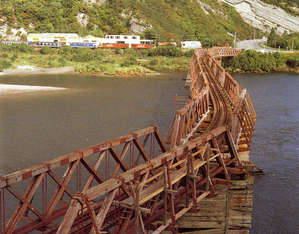 Да и пресловутые "японские фотолюбители" не всегда давали возможность подойти к окну. Взамен я отсканировал картинку из книжки — это самый высокий мост на трансальпийской магистрали, виадук Staircase Gully, его высота 72 метра: