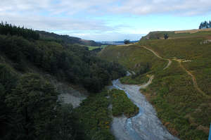 А вот так выглядит обычная для Южного острова горная речка — тонкий ручеек посреди широченного русла. Однако, надо полагать, что во время весеннего паводка и после дождей течение здесь бывает довольно бурное.