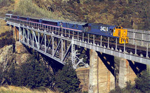 Вот через эти Южные Альпы и идет поезд TranzAlpine. Каждое утро в 8:15 он отправляется из Крайстчерча и проходит расстояние в 231 км до Греймута за четыре с половиной часа. На своем пути поезд проходит через несколько виадуков, переброшенных через горные ущелья, а также сквозь 17 тоннелей, в числе которых 8-километровый тоннель Отира. Кстати, заметьте, поезд идет по узкой колее, всего лишь 1067 мм, что почти на полметра меньше, чем у нас.
