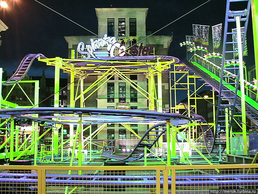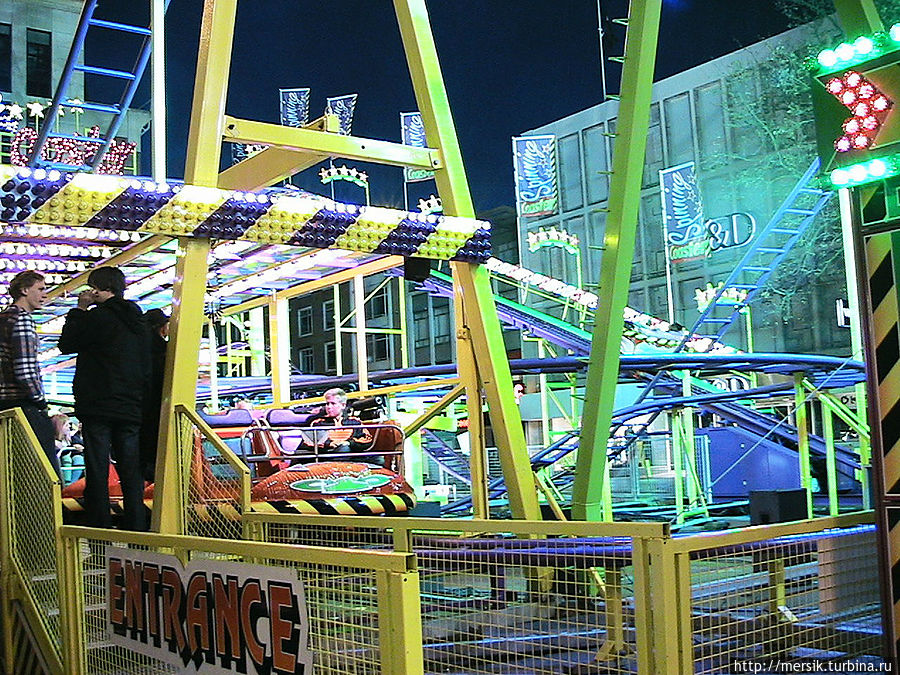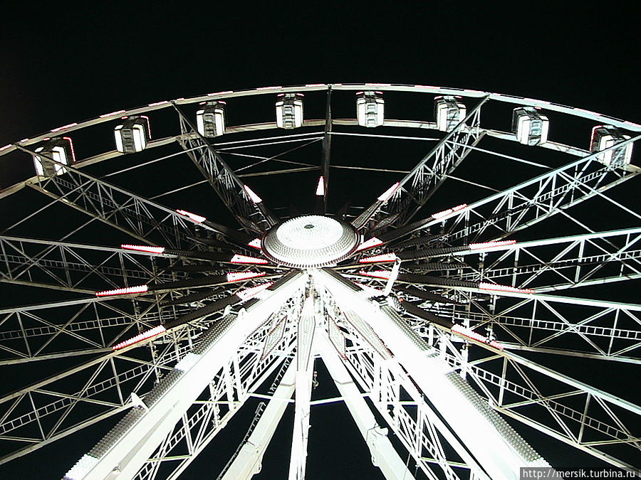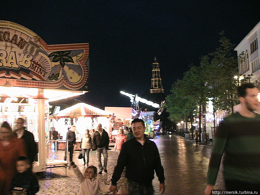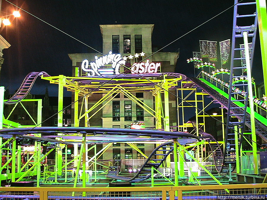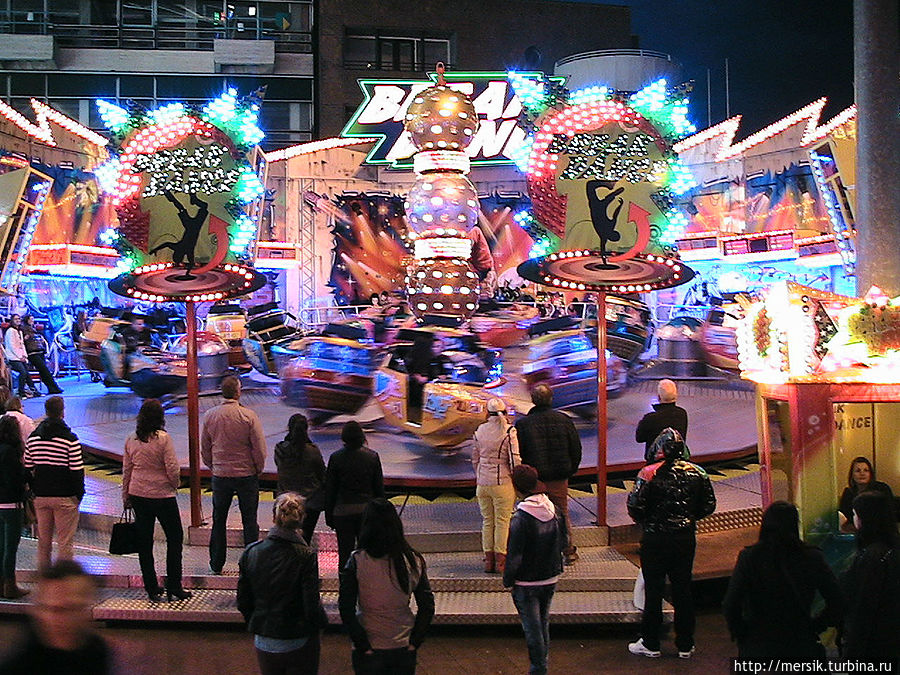 Вечер оказался безветренным и недождливым и поэтому мы решили погулять по вечернему городу, предполагая, что как раз ночью то все и начинается. Так и есть, на главной площади гремела музыка и работал огромный парк атракционов. Не известно, бывает ли у них так всегда, но в тот вечер народ веселился, отдыхали в основном студенты, однако встречались и семейные пары с детьми, и люди постарше. Обожаю быть среди студентов, может потому, что сын студент, может потому, что сами были когда-то ими и это одни из самых лучших лет в нашей жизни, может потому, что энное количество лет я проработала в ВУЗе. Затрудняясь воспроизвести название атракционов, могу сказать, что- назовем их "Американскими горками"- и у них, и всегда очень страшно, однозначно перед пивом, "Осьминог"- менее страшно, но лучше перед едой, колесо обозрения- совсем не страшно, в темноте же реально убаюкивает