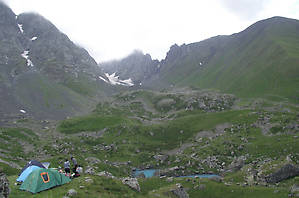 После небольшой фотосессии ищем оптимальный вариант для спуска. Кое как решились, начали спуск. Вначале крутизна впечатляла, но постепенно стало легче. И примерно через полтора часа отдыхали возле голубого озера.Это озеро вообще стоит отдельных слов.Оно даже не голубого, а бирюзового цвета, вода ледяная, хотя смельчаки купаются.Поблизости есть озеро зеленого цвета, а также белое озеро. Здесь же стояли 3 палатки с отдыхающими. Высота места около 2650 над уровнем моря. Открываем палатку возле озера, снова хорошая погода, красивый закат. Мне этот день доставил огромное удовольствие несмотря на усталость.