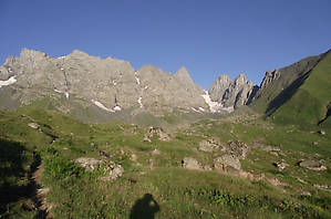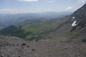 Недолго пообщавшись мы снова в дороге, идем по тропинке, которая время от времени исчезает то появляется. Через пол часа пути уже видна седловина перевала, туда лежит наш путь. Отсюда кажется не совсем реально подняться туда, но мы не отказываемся от первоначальной цели и держим путь в сторону перевала. Дорога все круче и круче, наш темп все медленнее. Несмотря на то что имеем GPS сбиваемся с пути, но кое как взбираемся на перевал.GPS показывает 3340 метров над уровнем моря. Погода отличная, отсюда просматриваются Абуделаурские озера, каждое из которых имеет свой собственный цвет. Справа Скалы Чаухи, слева гора Рошка.В общем красота неописуемая.