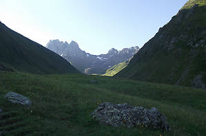 День 3. Встаем снова рано, около 7. Сворачиваем палатку, собираем вещи и в дорогу. Идем в Хевсурское село Рошка, что в 7 километрах вниз по хорошей тропинке. Через полтора часа доходим до деревни. Встречаем группу молодых туристов из Тбилиси. Они собирались идти в обратном направлении, через перевал, в Джута. Поговорив минут десять мы снова в дороге. Спускаемся к автодороге Тбилиси-Шатили. На дороге были еще через час. Машин почти нет и мы начали идти в деревню Барисахо, что по дороге в сторону Тбилиси. Вскоре попалась нам машина, водителем которой был молодой Хевсур, горячо любящий свою родину, который любезно довез нас до городка Жинвали. Из Жинвали ехали уже на общественном транспорте и за час были уже дома, в Тбилиси.