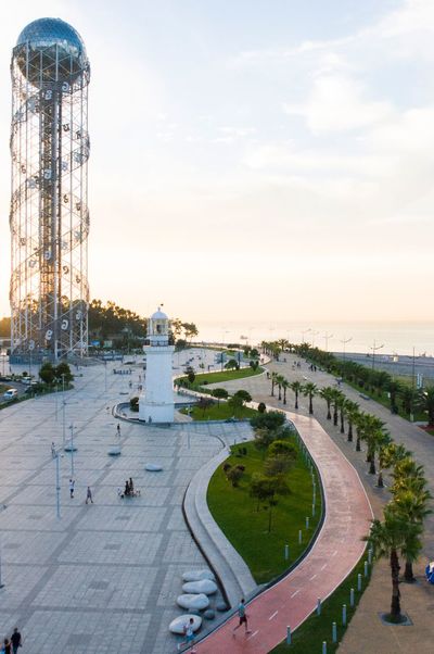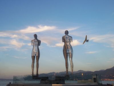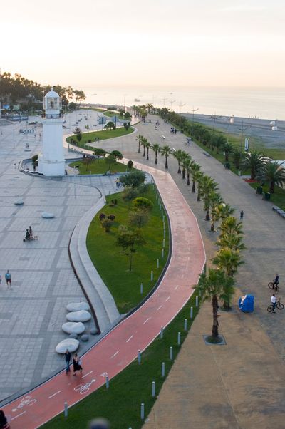 Я полюбила его всей душой)) Этот город такой разный — уютный, старый и тут же современный, местами непосредственный, местами важный, у города точно есть душа и она влюбляет))) Колоритные кафе и гостевые дома) Уличные кафе — моя слабость)) Башня Алфавит с хорошей смотровой площадкой. Ну и конечно инсталляция Али и Нино, две скульптуры из металлических пластин, медленно приближаются друг к другу, чтобы слиться на один момент, и затем пойти по следующему кругу... Восемь метров отношений за несколько минут. Пару дней не могли попасть на чертово колесо, днем, в самый солнцепек его выключают. В итоге успели в последний день прокатиться, вид с него на самое начало набережной, а чтобы пройти её до выезда из города понадобится около часа)) отсюда изобилие аренды великов и другого транспорта) Местами город по хорошему возвращает в советское прошлое)) В парке вообще есть чем заняться)) Мартышка дорвалась до селфи палки, впервые в жизни между прочим)) А сейчас начнется шоу фонтанов.