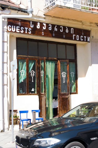 Вот они местные виноделы) Любимейший с детства перекус. А вот и местный друган — потребитель сосисок, хитрющий товарищ)) Поесть решили в кафе, которое как выяснилось засветилось в фильме «Любовь с акцентом». Вот такая картина встречает на входе.