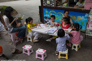 Что мне действительно нравится в азиатских городах, так то, что на улице запросто можно найти детей, которыми занимаются взрослые. Вот маленькие детки сидят и рисуют что-то в окружении «скайскрейперов» Гуанчжоу – Сити. Разве это не прекрасно, вряд ли конечно такое возможно в нашем «Москоу-Сити».