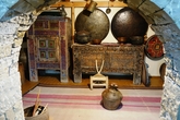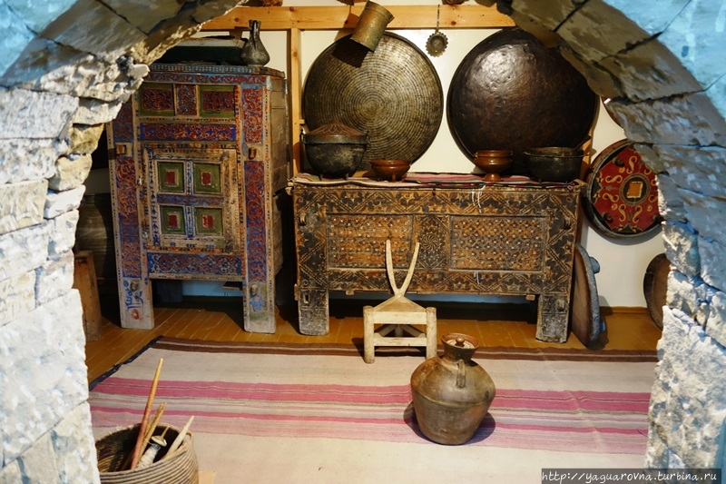 Здесь есть ларь для муки, огромный деревянный сундук для хранения зерна, молотильные доски для отделения зерна от колосьев, веялки, сеялки и тому подобные. На втором этаже воссоздана обстановка жилой комнаты, в которой нужные в хозяйстве предметы висят на стенах или стоят на полках. Большинство этих изделий – работа местных мастеров, много экспонатов выполнены из дерева. Есть, например, деревянные подносы, на которых месили тесто, а обратную сторону украшали резьбой и инкрустировали зеркалами. А вот гончарным ремеслом гунибцы не занимались, так как их глина не годилась для этого. Керамику привозили из признанных гончарных центров – Балхара, Сулевкента и Дербента.