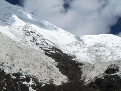 Нам удается сделать фото натянутых веревок с колышущимися флажками, которые украшают пешеходную арку, сложенную из камней. Фото этой арки с задником ледника выглядит очень сюрреалистично – как будто демонстрируя символический вход в Шамбалу.