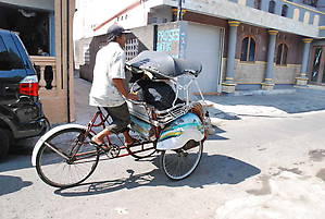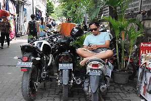 Но самым популярным видом транспорта является мотоцикл (байк, скутер,мопед и иже с ними). Со стоянками никаких проблем нет (ставят вдоль двухполосной дороги в три ряда), потому и большие пробки — обычное явление.На байках можно перевозить тяжести, и вот так удобно сидеть, почему-то не падая