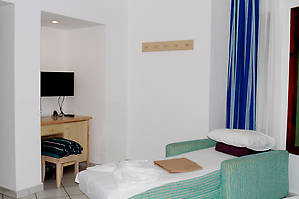 Отдыхали мы с женой и с восьмилетней дочкой. Немного расстроила не очень большая жилплощадь. В номере изначально находится одна двухспальная кровать и раскладное кресло, которое "по запросу" превращается в дополнительную кровать для ребенка. Учитывая этот факт, наш номерок стал еще более тесным, но это все мелочи, ведь мы приехали на курорт не для того чтобы в номере сидеть, приходили туда только переночевать, ну и иногда подремать после обеда. В номере имеется телевизор (небольшой) с 3 или 4-мя русскоязычными каналами, и еще штук 20 немецких, турецких и английских. Есть небольшой холодильник-минибар с питьевой водой. Также имеется сейф (платный) в котором администрация рекомендует хранить деньги, документы, и другие ценные вещи, ато мало ли, может кому из персонала что-нибудь и приглянётся...