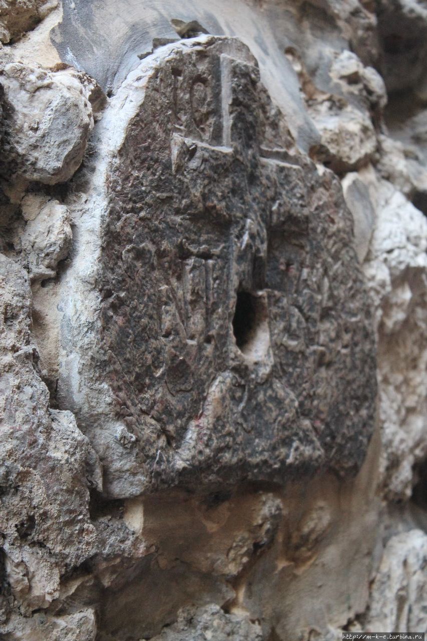 Следующая остановка — пятая находится на углу Виа Долороса и Эль-Вад. По описанию все вроде понятно. Дан угол и вроде как его не найти? Только нигде не написано, что Виа Долороса до этого перед остановкой три уперлась в тупик и вроде как закончилась. Чтобы найти ее продолжение, нужно пройти мимо остановок три и четыре до следующего перекрестка мимо базарных рядов и справа увидим справа продолжение и табличку Виа Долороса. Здесь же на углу францисканская церковь и остановка пять, где римские солдаты , раздраженные медленным продвижением своего пленника, заставили Симона Киринеянина нести крест вместо Иисуса. Справа от церкви углубление, которое считается следом от руки Иисуса, опершегося о стену, освободившись от креста.
