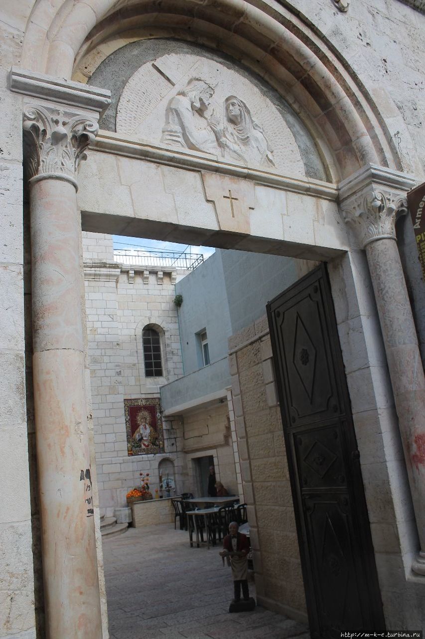 Рядом справа — четвертая стоянка — встреча с Матерью. Как ориентир вверху барельеф, изображающий встречу. Войдя в арку попадем на территорию армянской католической церковью Богоматери Великомученницы. Построена церковь на фундаменте византийского храма,поэтому внутри сохранились остатки византийские мозаики, в центре которых видны следы от подошв сандалий Девы Марии.