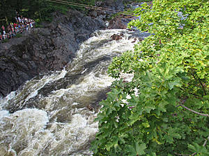 Лес не лес.Ну а далее мы направились прямиком в Иматру, до которой оставалось менее 50 километров. Очень часто в отзывах или комментариях про этот город пишут, что в нём совершенно нечего делать. И я соглашусь, что нет тут размаха и особых изысков в архитектуре, да и достопримечательностей раз, два — и обчёлся. Но всё-таки, тут есть чем заняться.Основной достопримечательностью города является водопад Иматранкоски. Находится он в центре города (что следует из названия). Для того, чтобы не плутать, ставьте на навигаторе МакДоналдс. Там и паркуйтесь. После занимайте место в одной из беседок на берегу Вуоксы (чуть вниз к реке) или пройдите вперёд к мосту — оттуда зрелище будет ярче. Правда, народу обычно тьма со всеми вытекающими — толкаются и распихивают локтями. А суть "аттракциона" состоит в том, что ежедневно в 7 вечера (fin) на ГЭС поднимают ворота, и вода свободно падает по каменистому руслу Вуоксы. Всё это дело сопровождается музыкой и световым шоу. Особенно эффектно в тёмное время. Зимой, кажется, всё происходит на час раньше. Так что водопад этот техногенный и весьма условный.