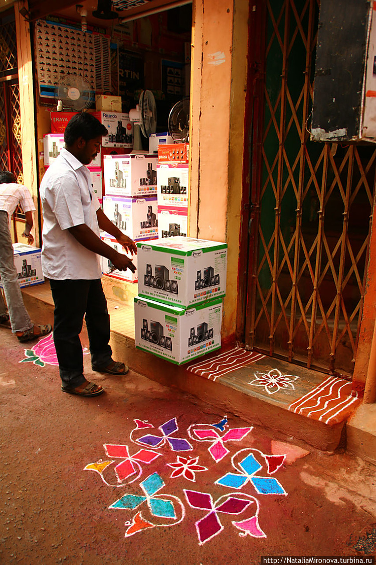 Используют этот цветной порошок для ранголи — затейливого орнамента у входа в дом, в магазин.
