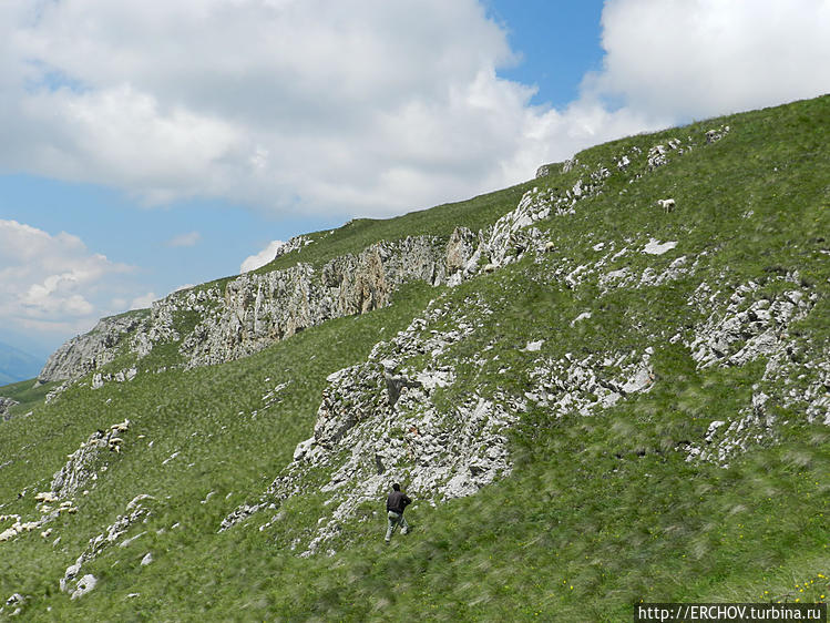 С каждым шагом приближаемся к стаду барашков. Оставшийся с отарой пастух кидает камнями в непослушную парочку, пытаясь согнать их со скалистого уступа, но, кажется это бесполезно. Барашки уткнулись мордой в траву, и не желают воссоединяться с основным стадом. Пастух ругается и лезет за баранами вверх по склону, увидев нас, останавливается.