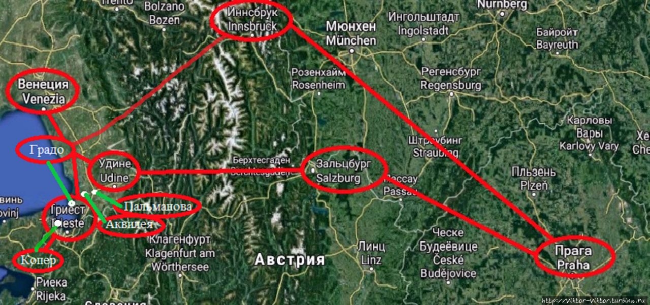 Инсбрук).Маршрут европейского автопутешествия Прага(Мельник)-Зальцбург-Градо-(Венеция-Аквилея-Пальманова-Удине-Триест-Копер)-Градо-Инсбрук-Прага(Мельник)