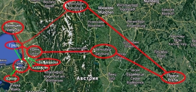 европейское автопутешествие протяженностью 2225 км по дорогам 5 стран (Чехия, Австрия, Италия, Словения, Германия) с посещением 9 городов (
