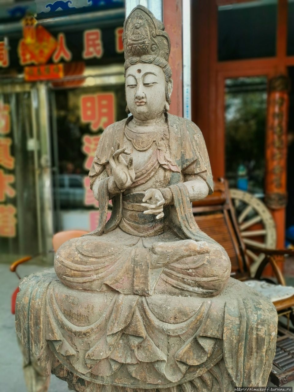 Вход на территорию храма Фогун и пагоды стоит 50 юань, туристов очень много. Перед входом стоит красивая статуя Гуань Инь, китайский эквивалент Бодхисатвы Сочувствия Авалокитешвары, одного из главных персонажей в буддизме.
