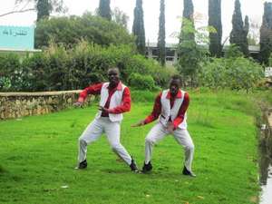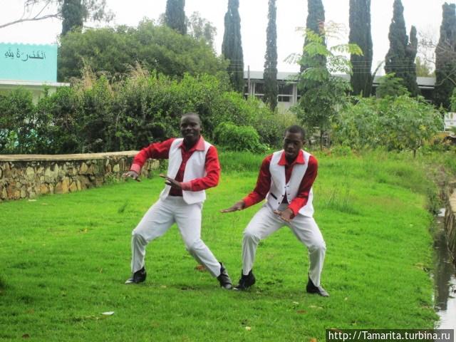 Стало ясно, что будет съёмка. Снимали музыкальный клип под африканскую музыку. Парни танцевали прямо на фоне кипарисов, красиво контрастируя своими красными рубашками.