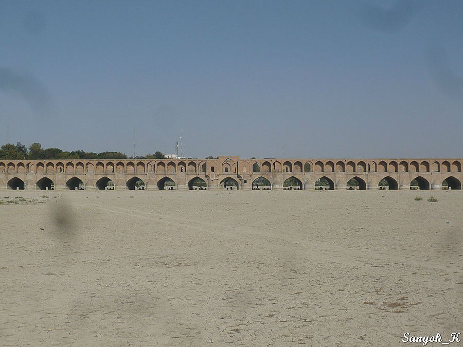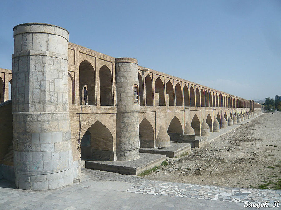 Знаменитыми архитектурными сооружениями Исфахана являются мосты. Начните свою прогулку от Моста тридцати трёх арок (Си-о-Се Поль). Вечером мост превращается в популярное место среди молодежи благодаря укромным местам и углам, ненавязчивой подсветке, а также хорошей чайхане. В то время, когда я там был, реки у моста не было. Оттуда можно пешком прогуляться до моста Кхаджу́ (Поль э Кхаджу́) и доехать на транспорте до самого старого моста в городе – Моста Шахрестан.